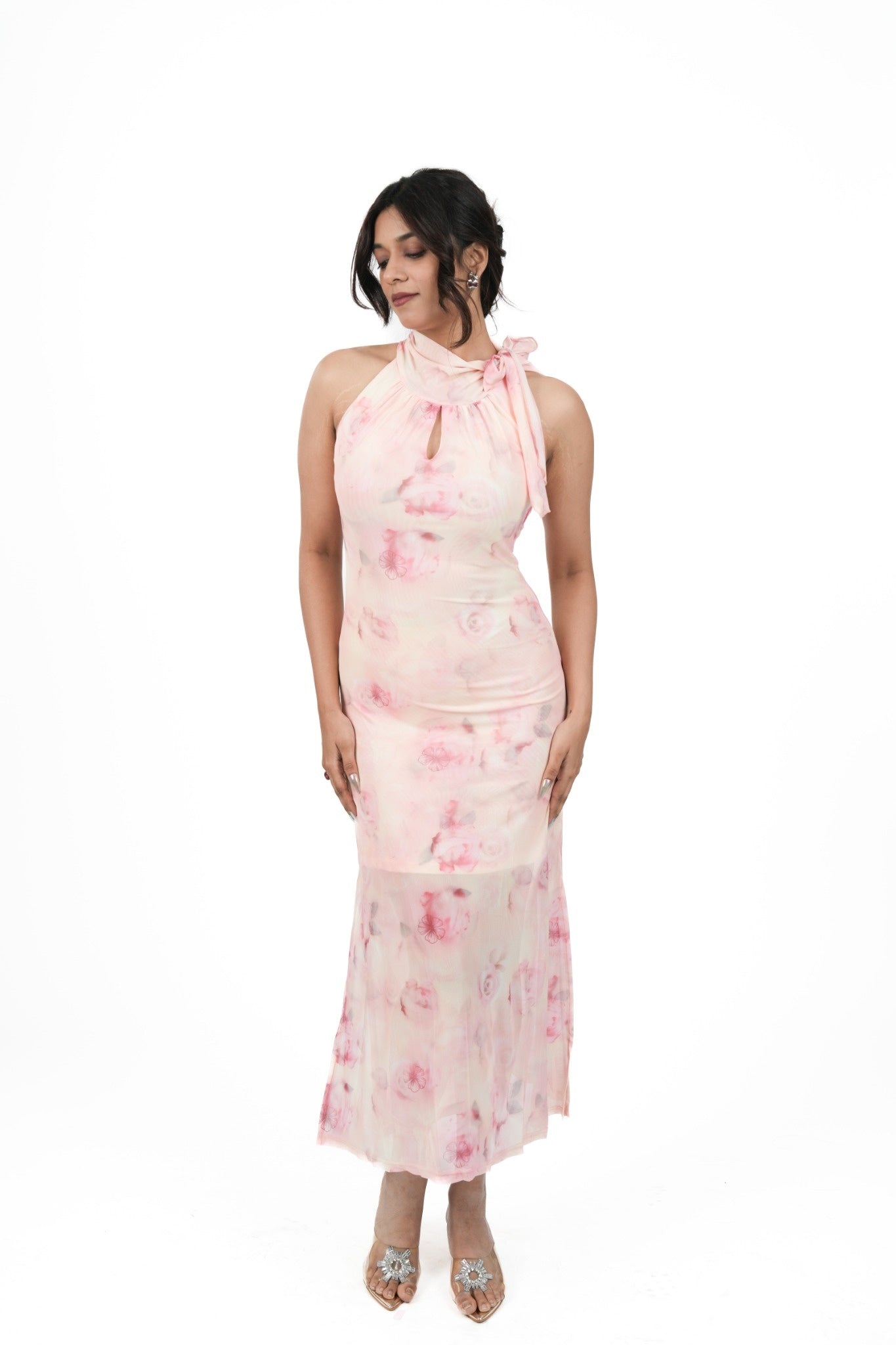 Dreamy, romantic, and undeniably graceful — Blush Kiss is for nights when you want your style to speak volumes without you needing to say a word. The halter-neck silhouette beautifully highlights your shoulders, while the keyhole cutout adds a hint of allure. Soft watercolor florals bring texture, depth, and a sophisticated softness, making sure you’re turning heads with pure ease.