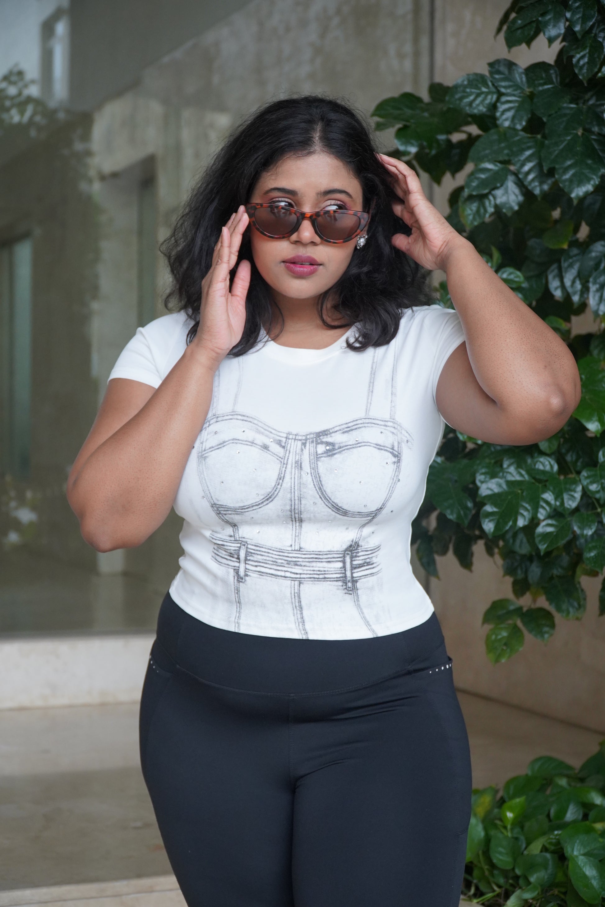 This tee is what happens when soft girl daydreams meet 2000s print fever. A corset drawn on like a sketchbook fantasy, with tiny rhinestones that sparkle every time you breathe out a sigh of “ugh, men.” She’s girly, she’s graphic, and she’s already halfway to being iconic.