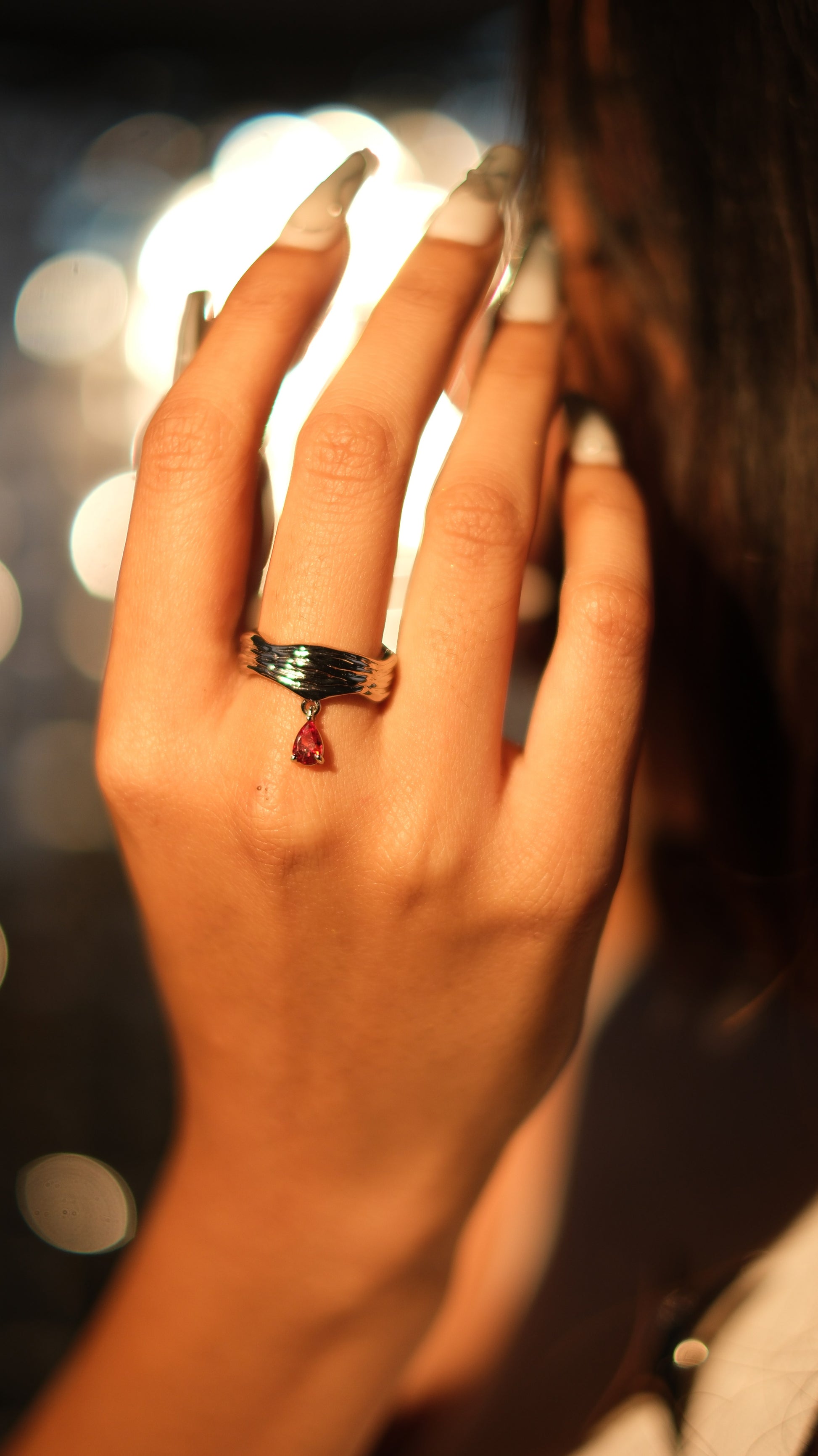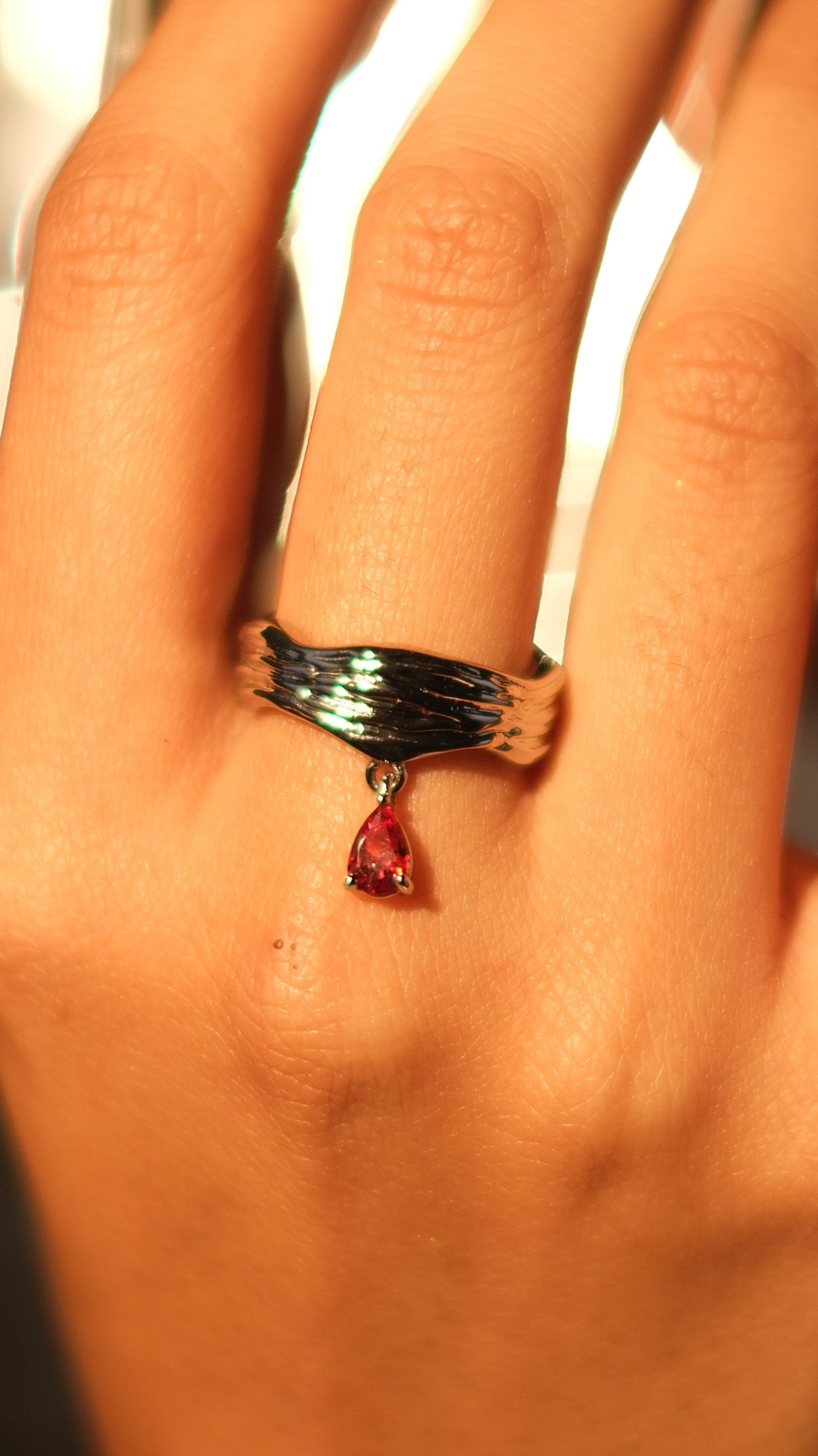 A single crimson drop, rich and deep, like blood spilled in the heat of the moment. The band, raw and molten, clings like the memory of a wound that never quite healed.