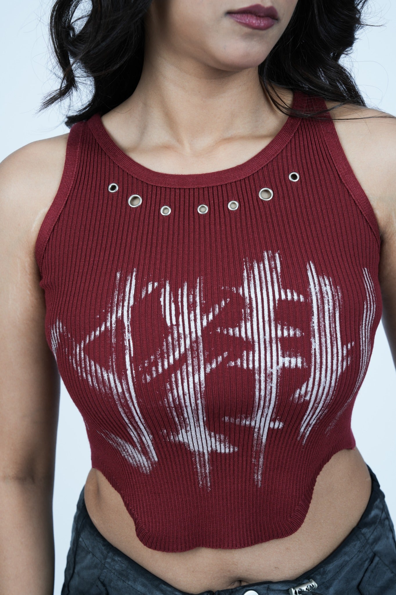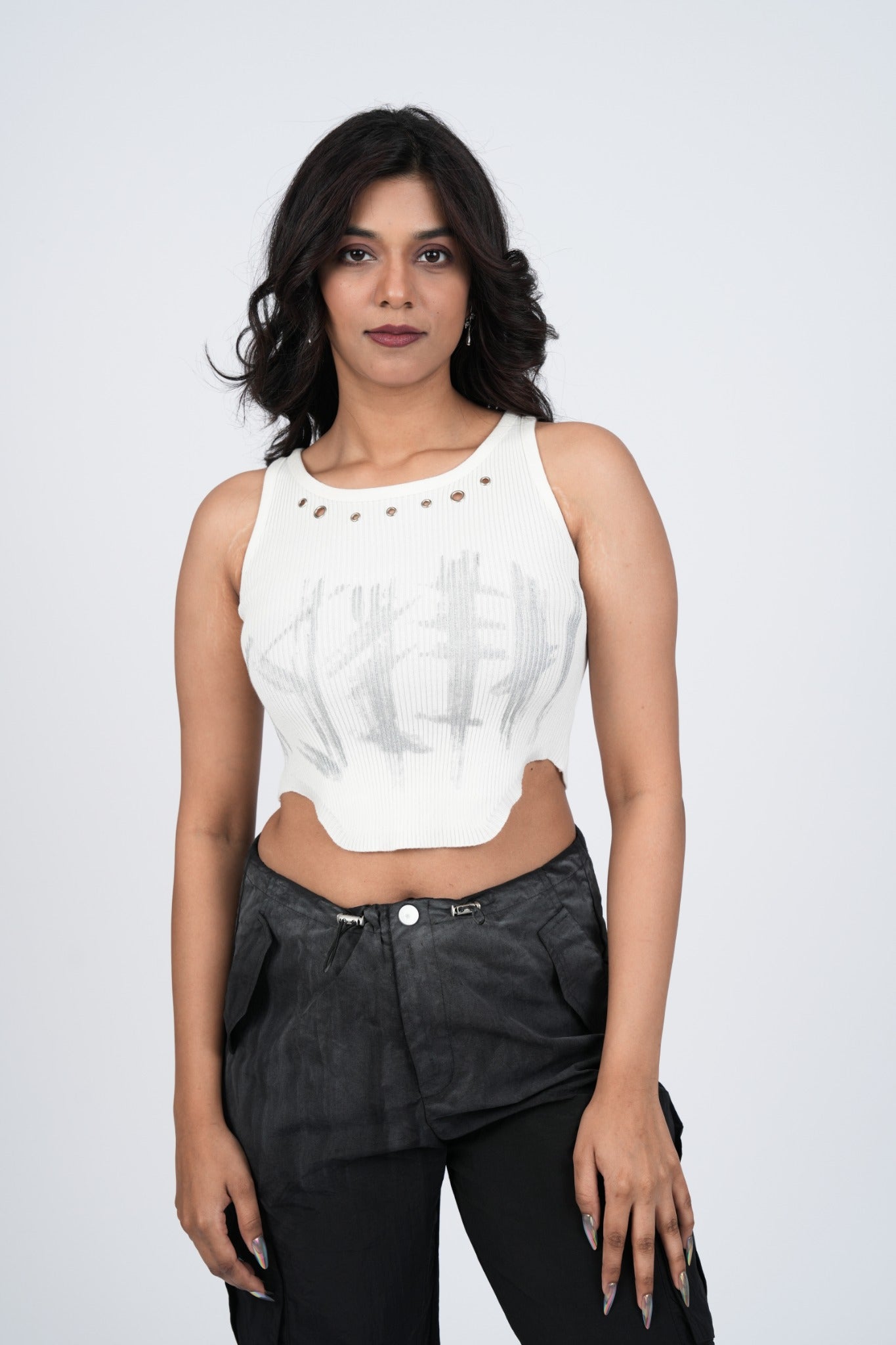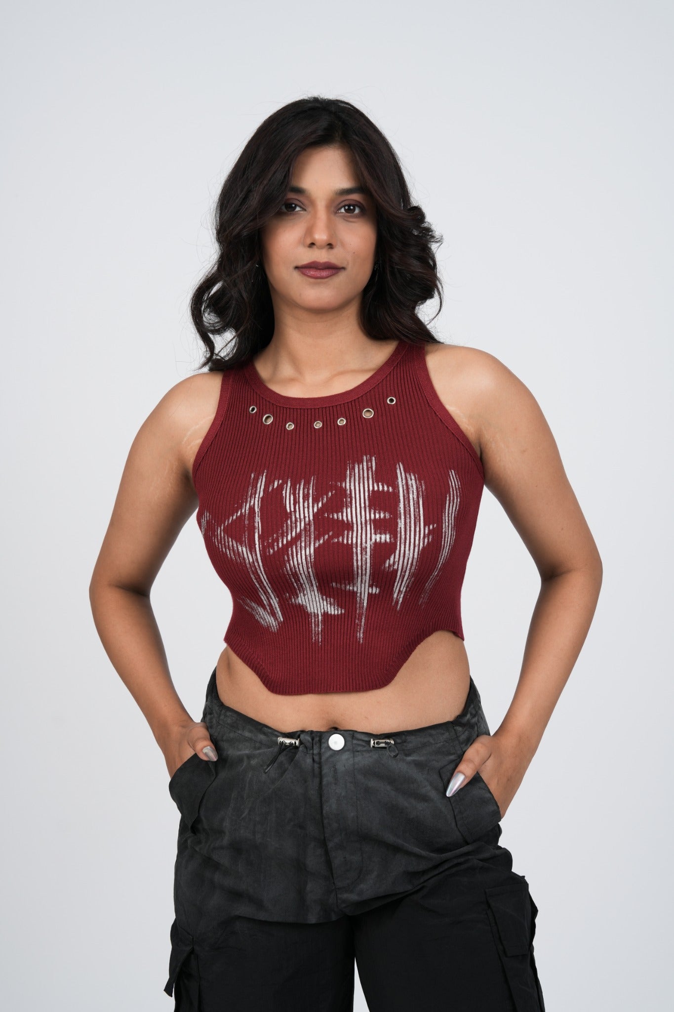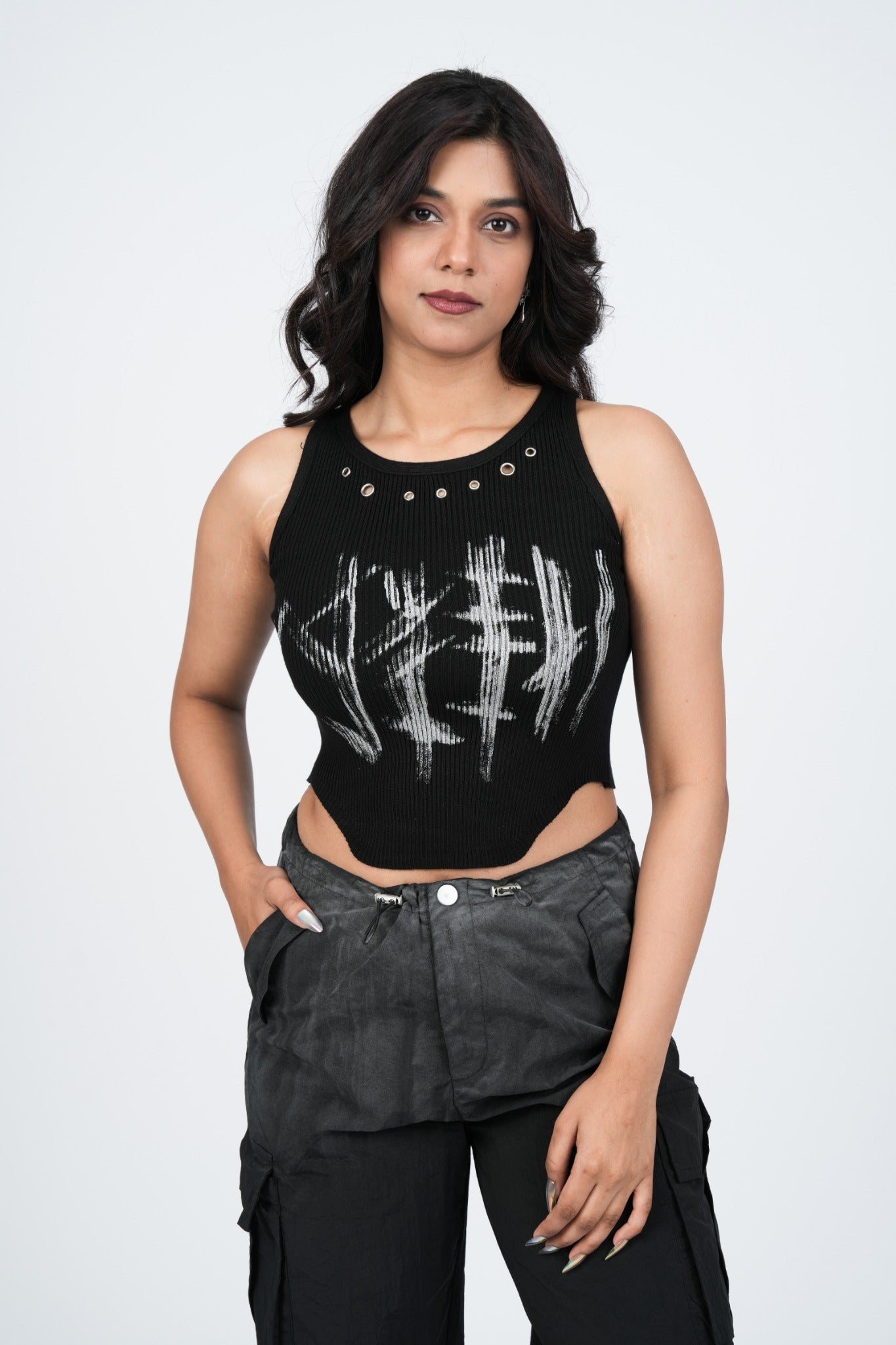 This crop top channels a bold, street-style energy with a touch of rebellion. Inspired by raw graffiti art, it features abstract brushstroke graphics splashed across the front and a silver eyelet detail lining the neckline. The wave-cut hem with dipped sides sculpts the waist for a sharp, standout silhouette.