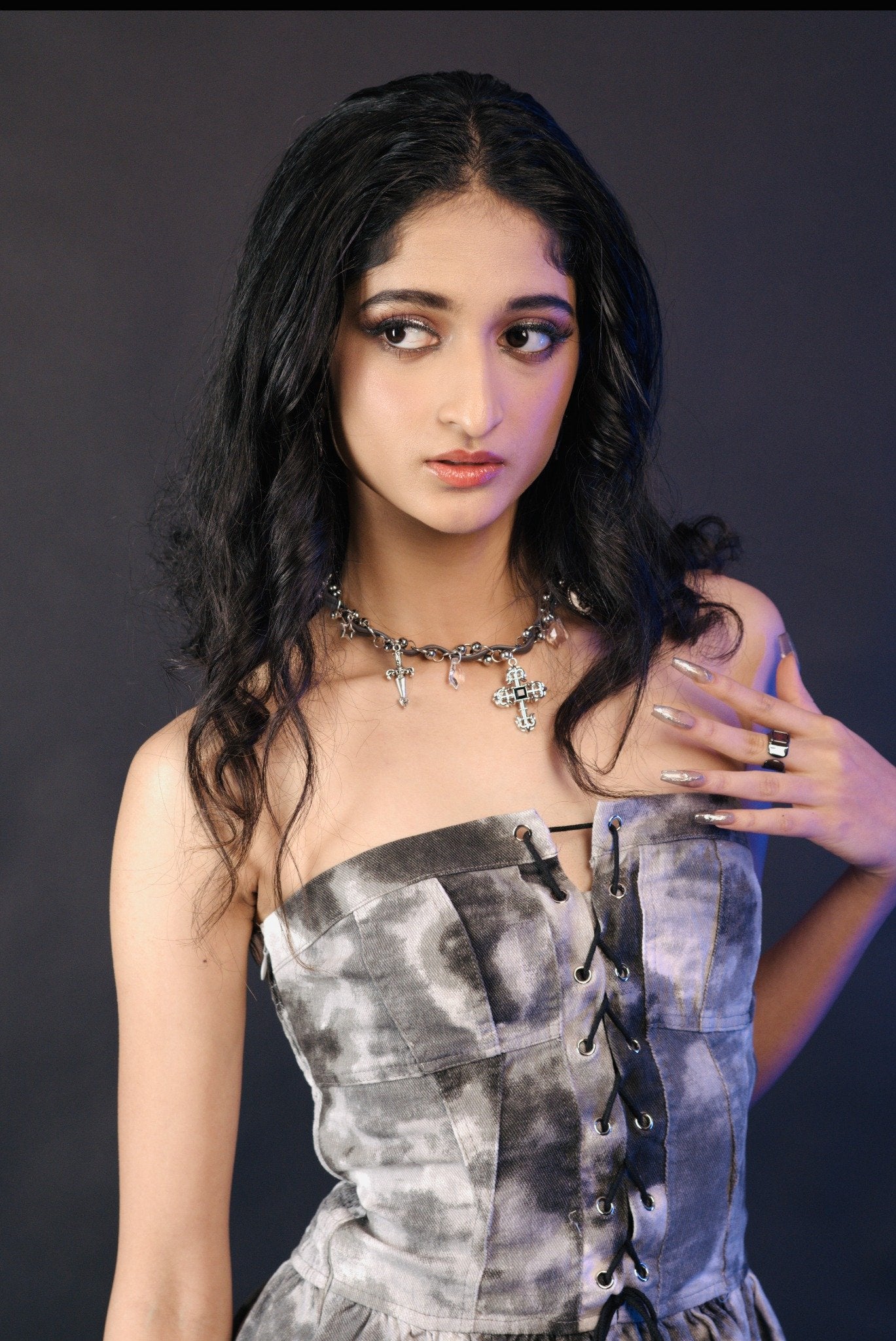 Built like a villain arc, stitched like a power move. This grey-black corset dress doesn’t beg for attention—it demands it. With bold abstract swirls that scream chaos and corset lines that mean business, this piece is giving “I don’t start drama, I star in it.” The neckline? Non-existent. The fit? Snatched. The energy? Too cold to care.