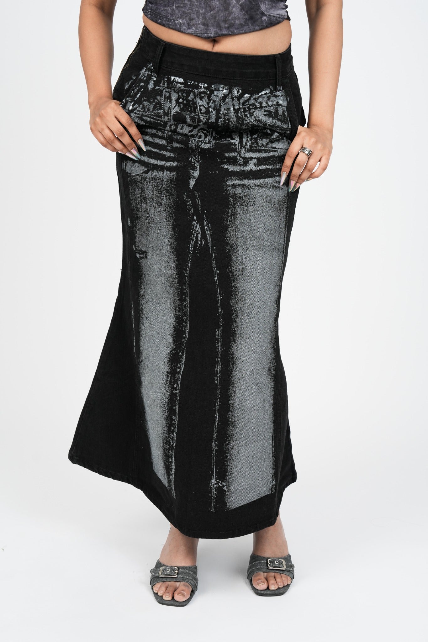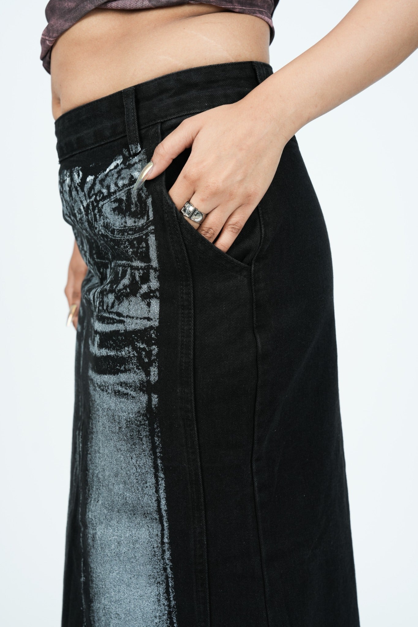 Crafted from heavyweight washed denim, it balances grit with graphic illusion. The print itself is intentionally disrupted — raw, imperfect, industrial. There’s something deeply emotional about the way it echoes the jeans that once were, now reimagined as a long, lean skirt silhouette.