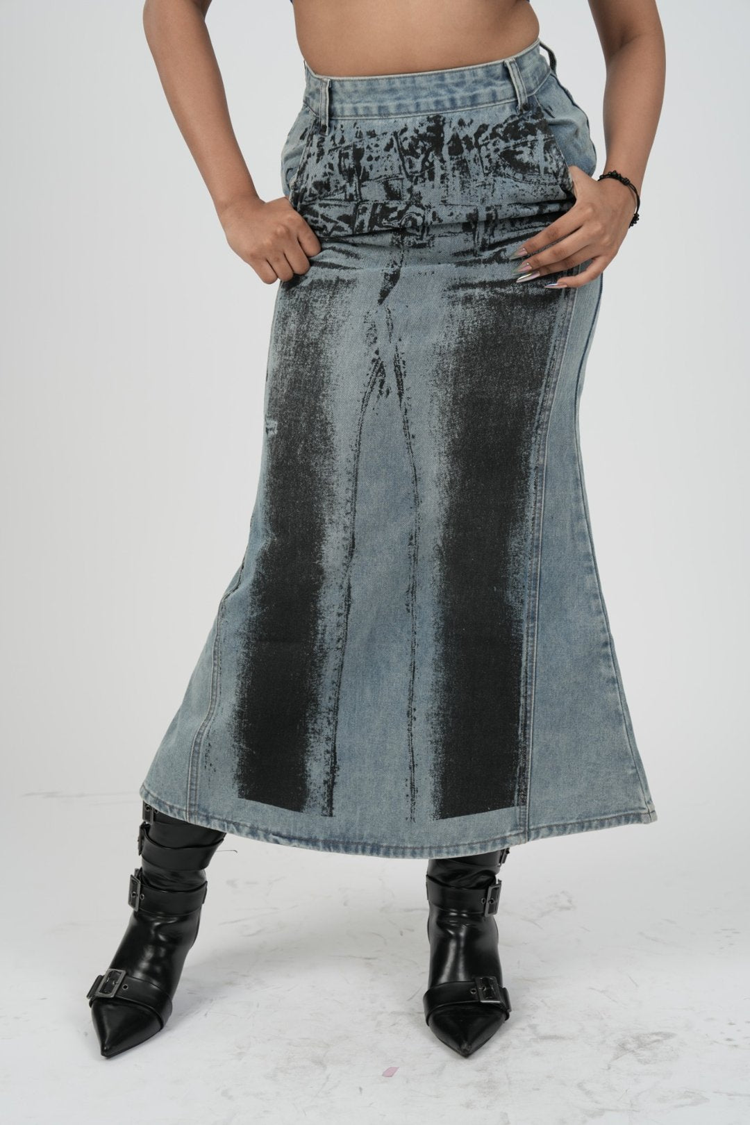 Crafted from heavyweight washed denim, it balances grit with graphic illusion. The print itself is intentionally disrupted — raw, imperfect, industrial. There’s something deeply emotional about the way it echoes the jeans that once were, now reimagined as a long, lean skirt silhouette.