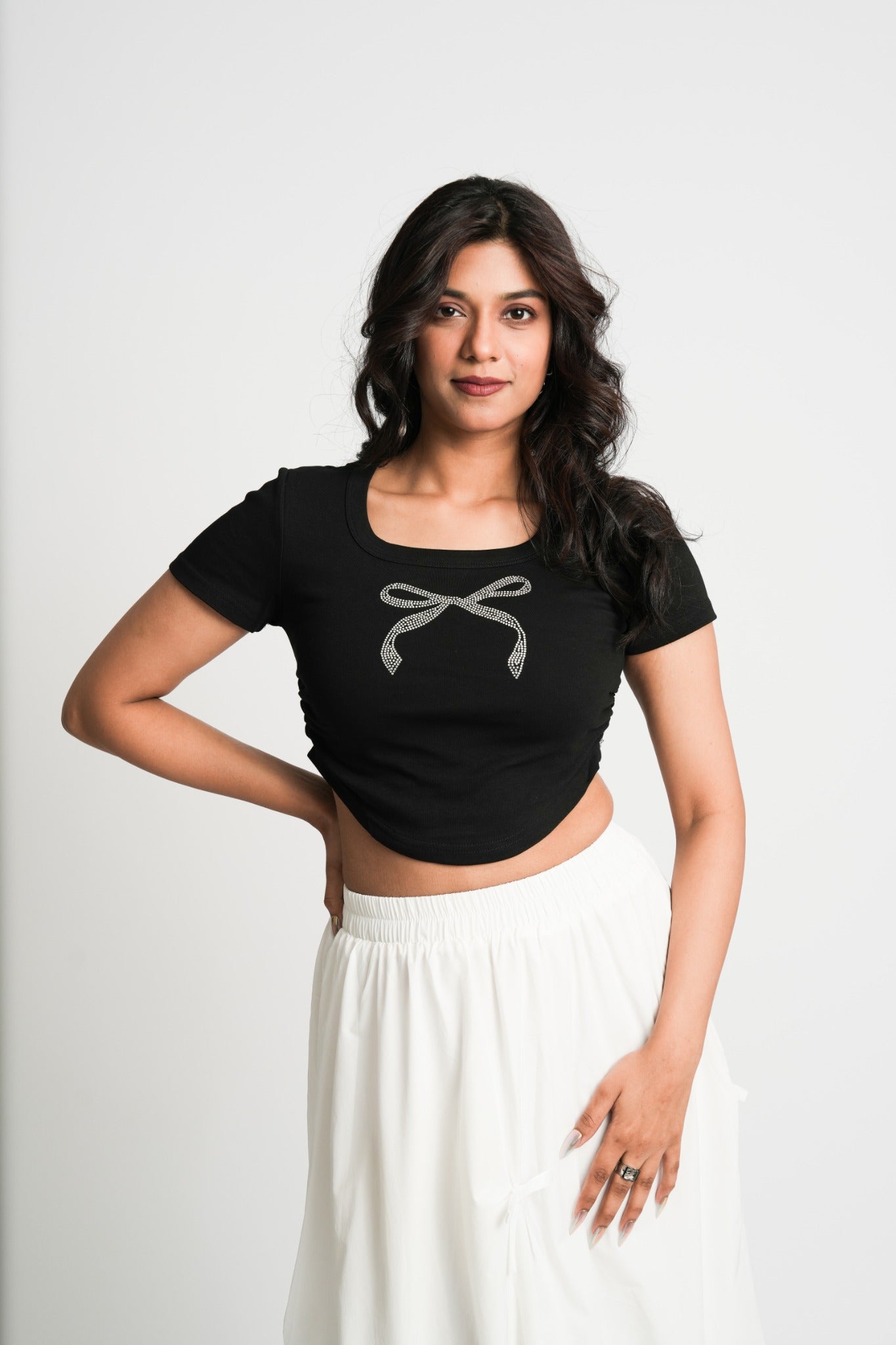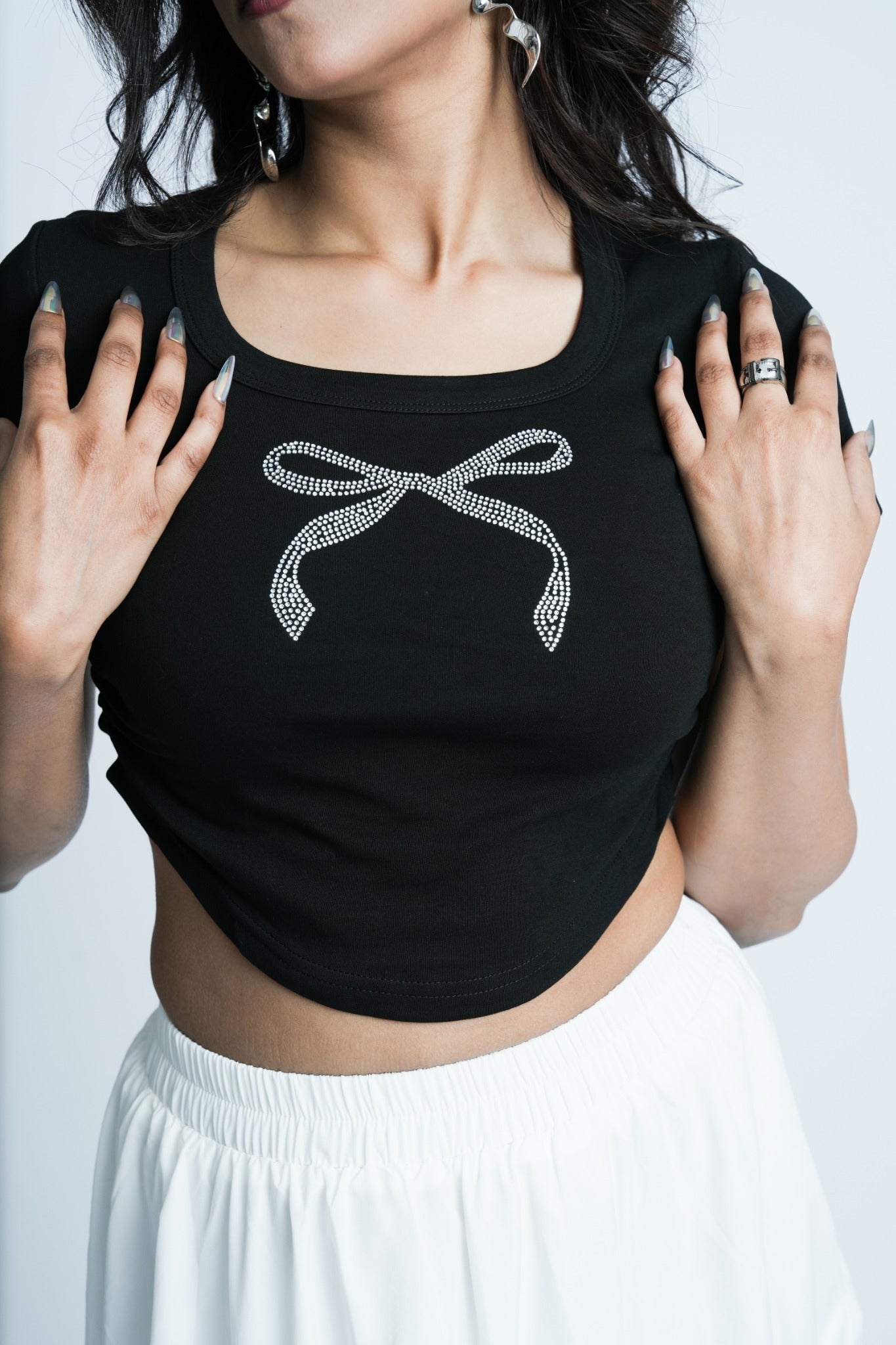 This one isn’t loud — it doesn’t need to be. IN A BOW is all about the subtle things: the glint of a rhinestone bow, the curve-hugging fit, the soft cinch along the sides that brings the fabric in just enough. It frames your silhouette in the quietest, most thoughtful way. There’s something incredibly intimate about it — like it was made just for you, and maybe it was.
