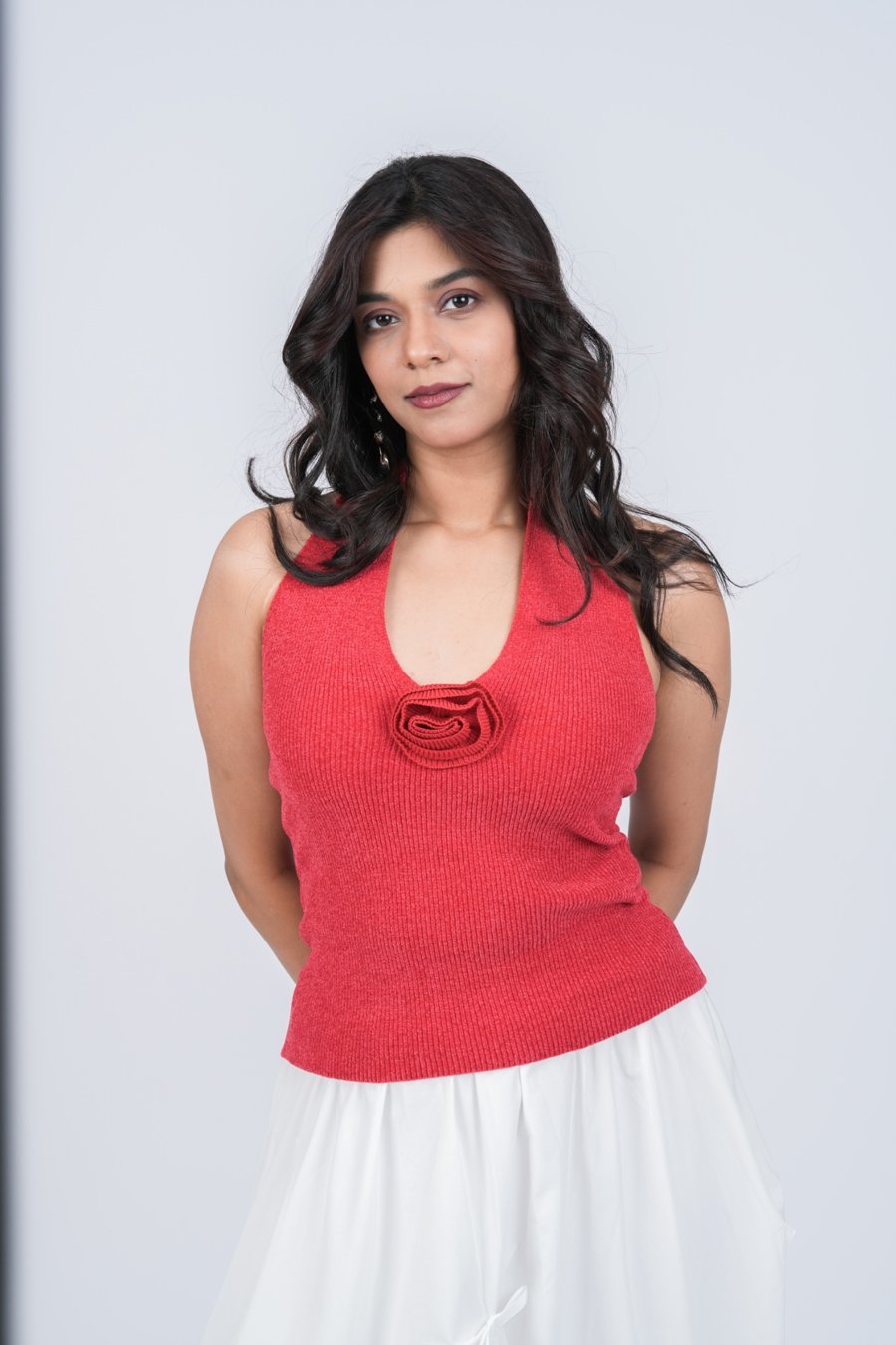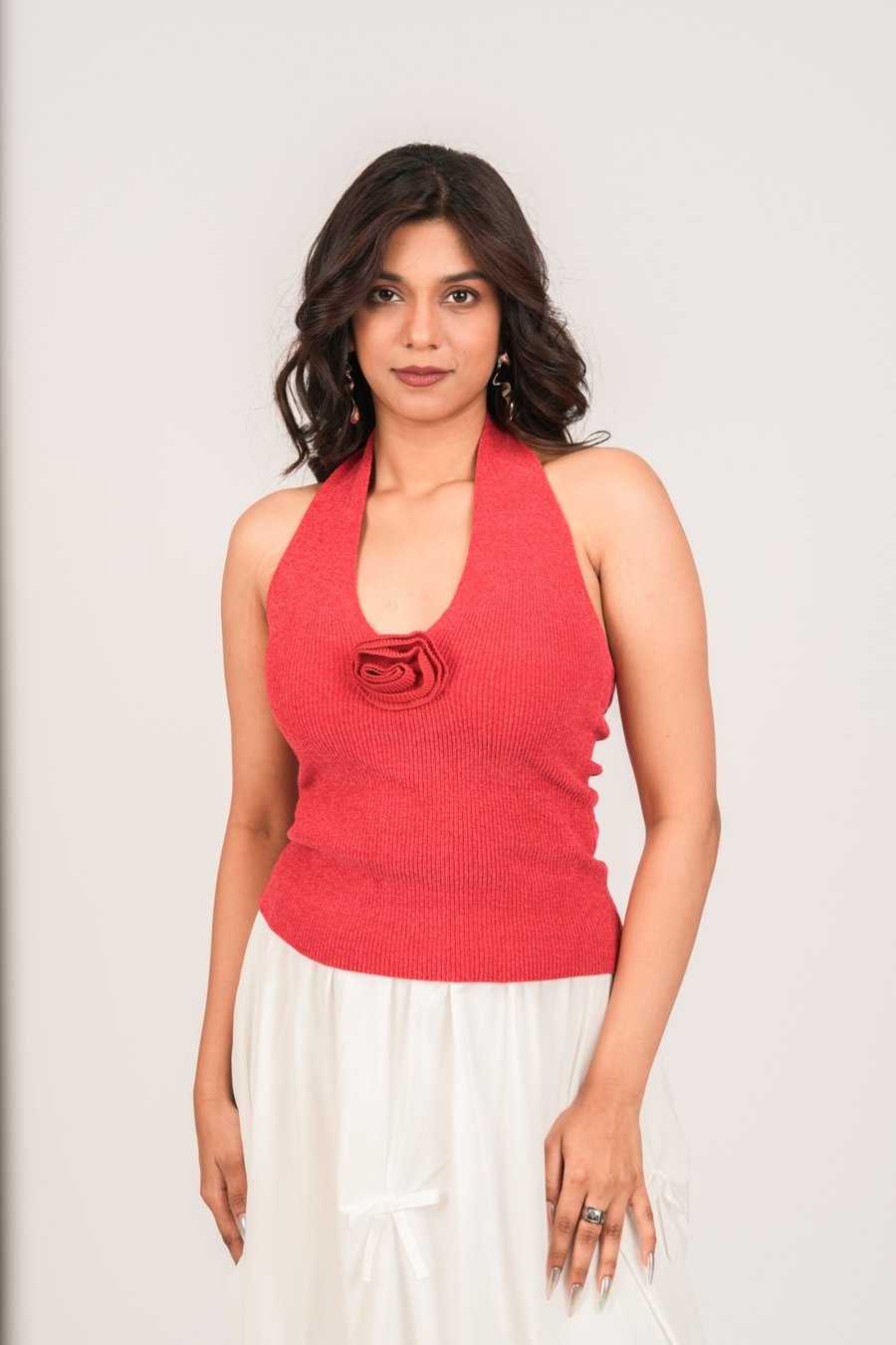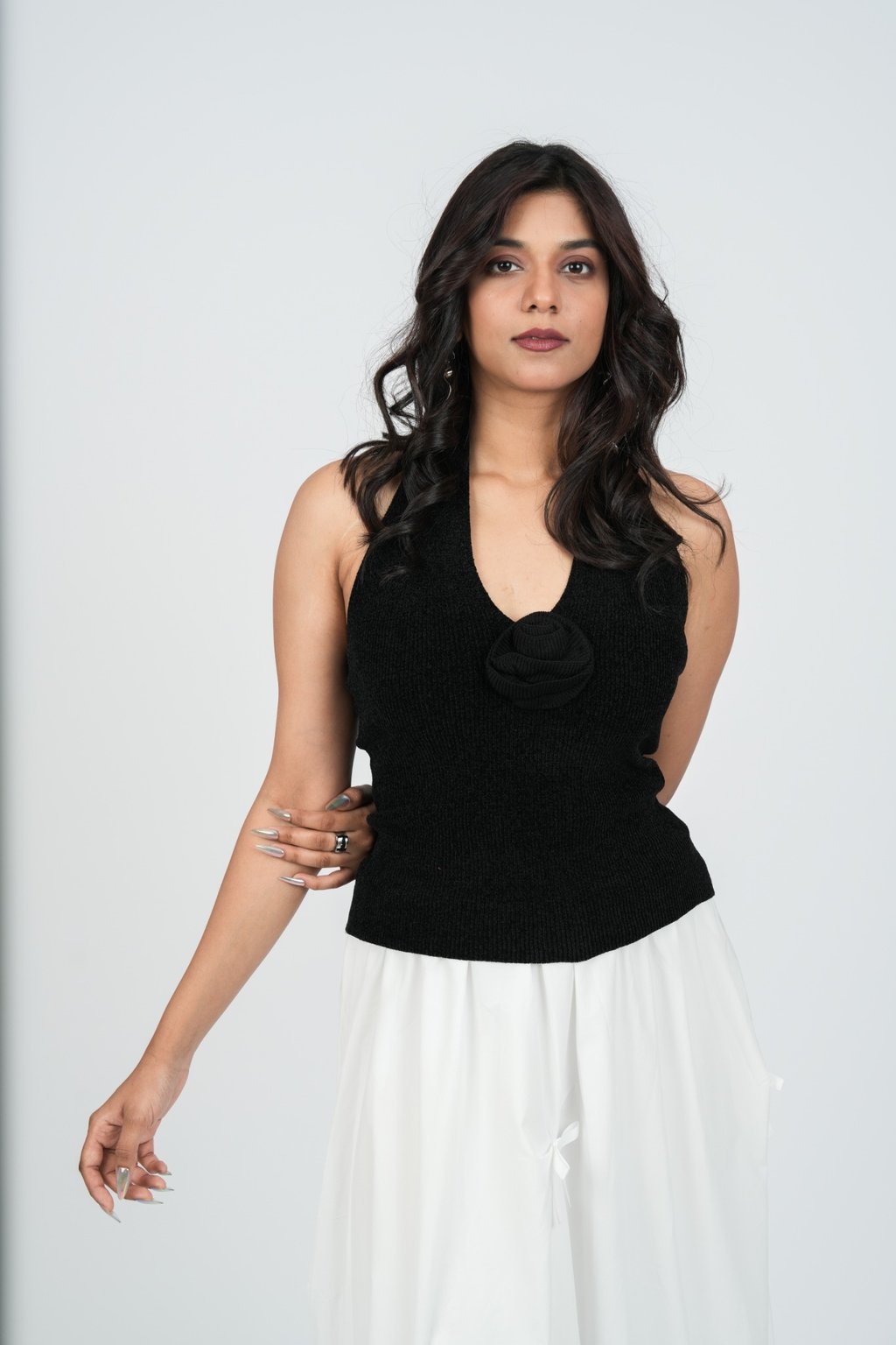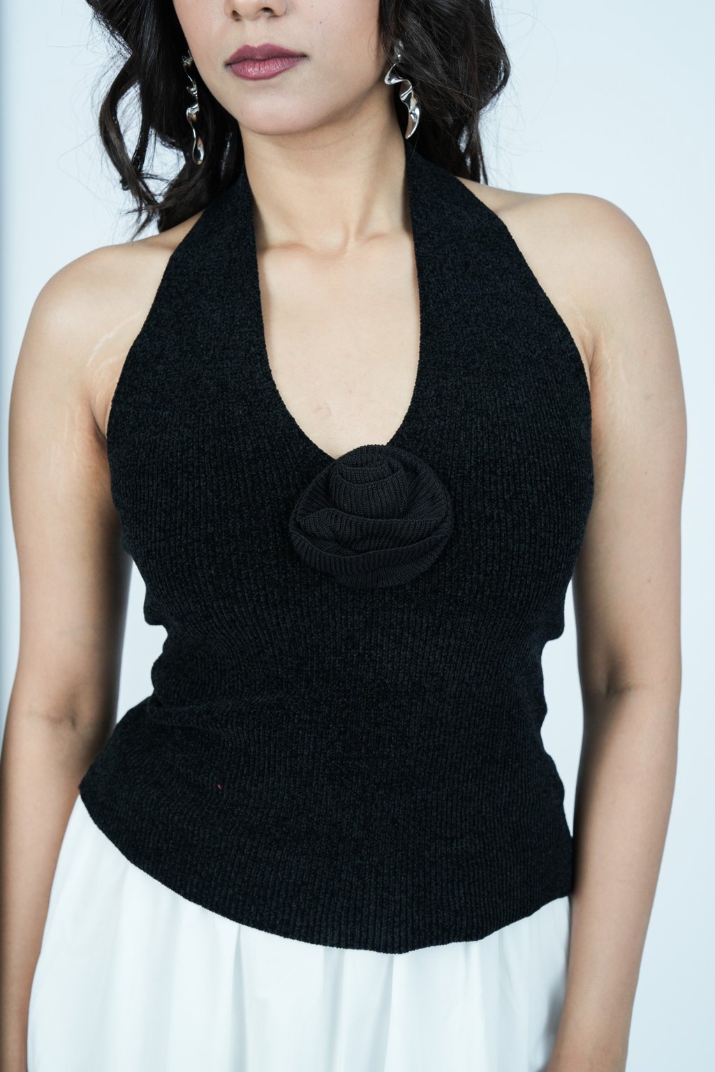 There’s something about La rose that lingers. Maybe it’s the single sculpted rose resting near the heart, or the halter neckline that skims the collarbones just right. Maybe it’s the way the ribbed knit hugs and releases in all the right places — never too loud, but never forgettable either. This top feels like a moment. One you didn’t plan for, but don’t want to end.