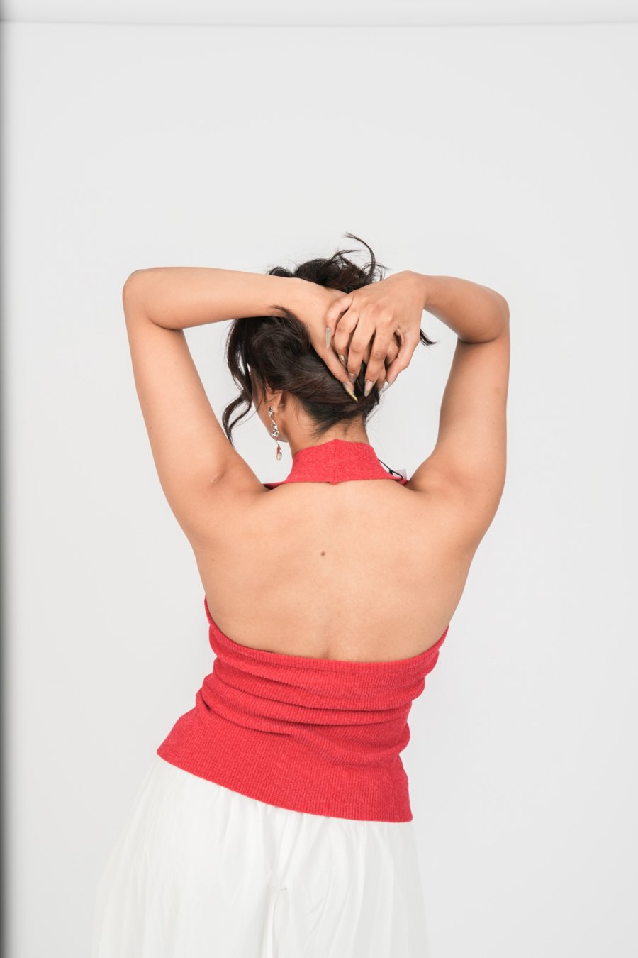 A cozy, breathable ribbed knit with soft hold. The halter cut shapes your shoulders while the body contours to you — fitted, flattering, and gently bold from front to back.