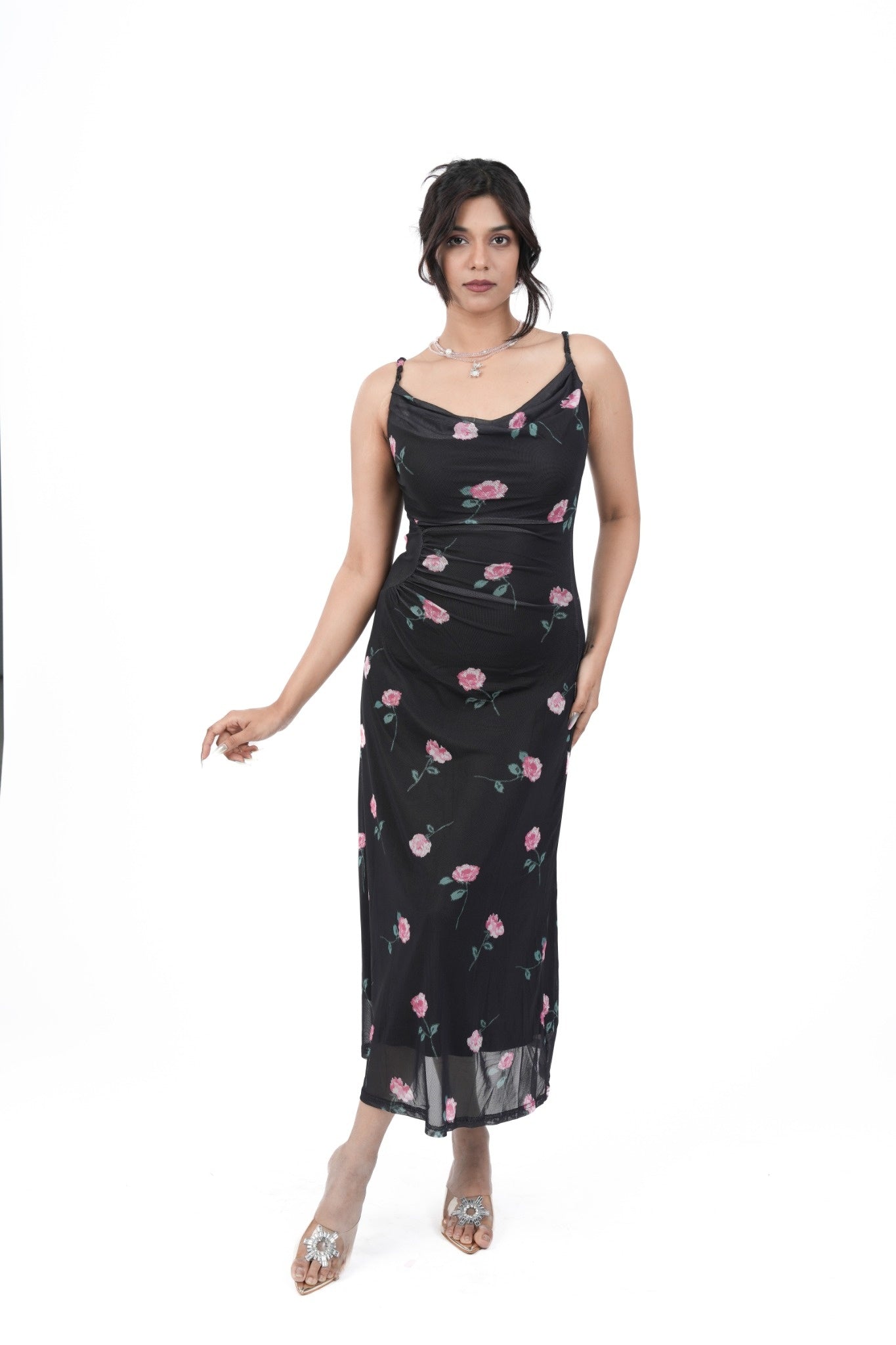 The flirty cowl neckline adds a soft, seductive drape, while the mesh overlay brings texture, depth, and that glamorous, barely-there allure. The silhouette gracefully hugs your curves and falls into a flowy, dream-like shape — perfect for a night filled with confidence, temptation, and a whole lot of compliments.