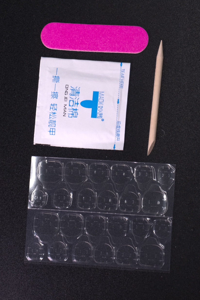 With every order, we’re throwing in a free application kit! You get a cuticle pusher, nail filer, alcohol wipes, and 24 glue tabs — all on the house 💅Â