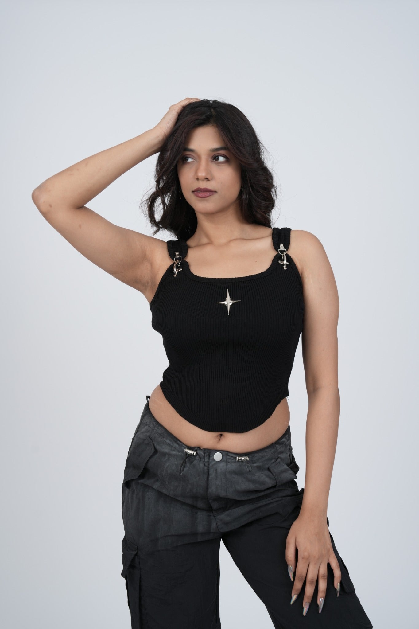 Strap in — literally. Orbit Baby is your ultimate it-girl tank: bold, body-hugging, and built for chaos. Featuring chunky metal hardware on the straps and a chrome starburst at the center, this ribbed knit top sculpts like second skin while keeping your outfit in full main character mode. Sleek, sexy, and just the right amount of dangerous.