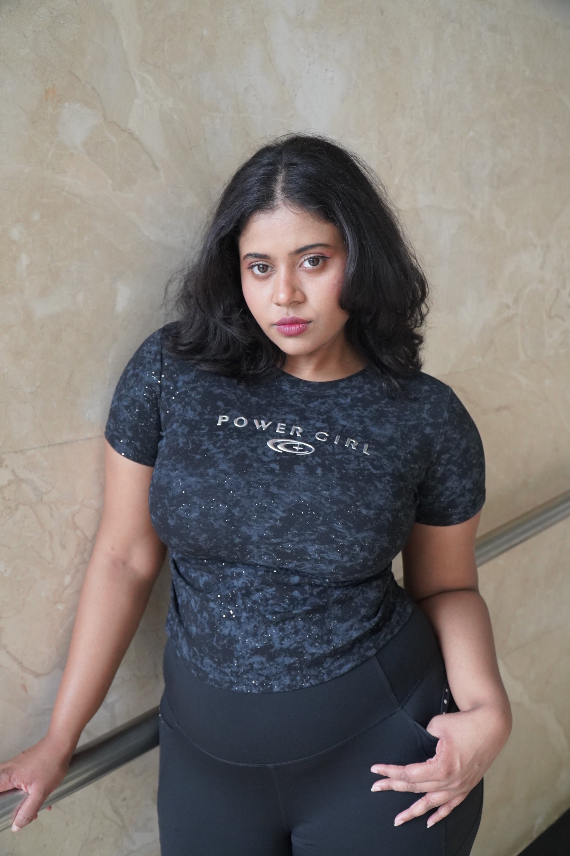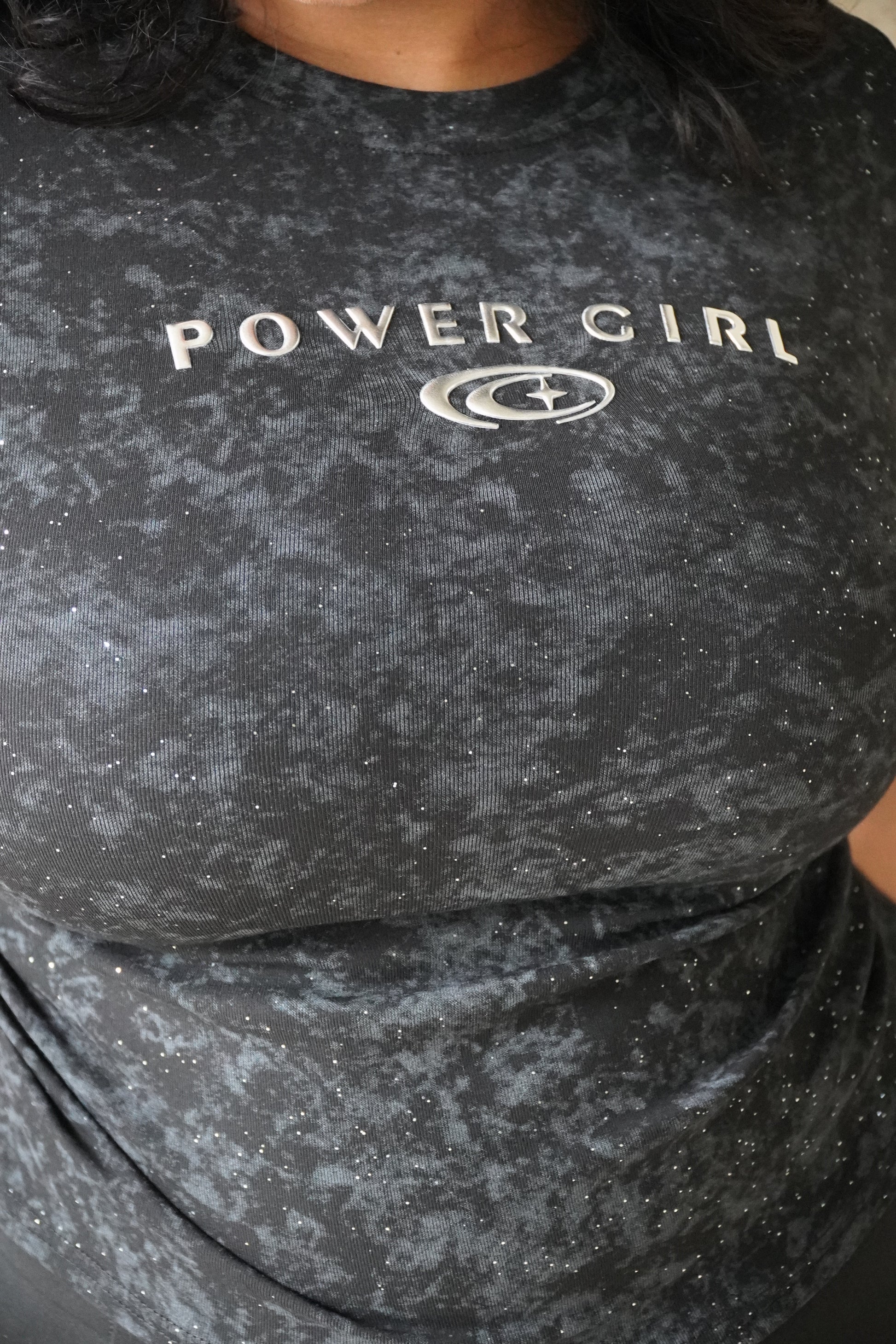This tee’s got that sky-dyed finish and a little cosmic shimmer — but don’t get it twisted, she’s more hustle than horoscope. The “Powergirl” says it like it is. No fluff, just facts.