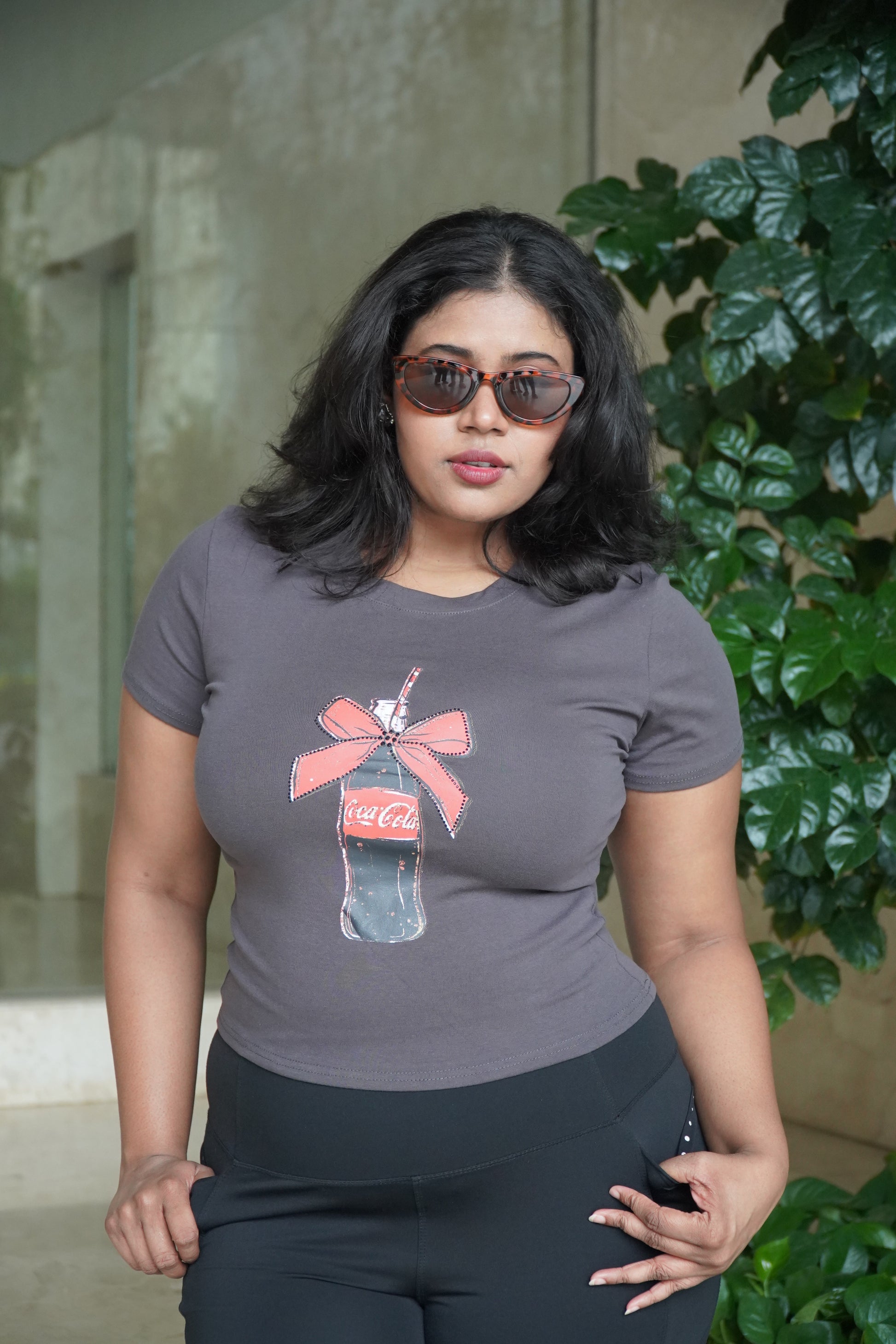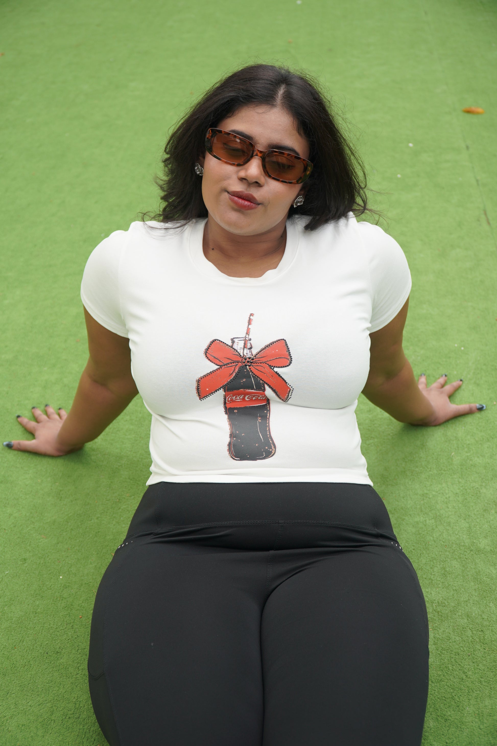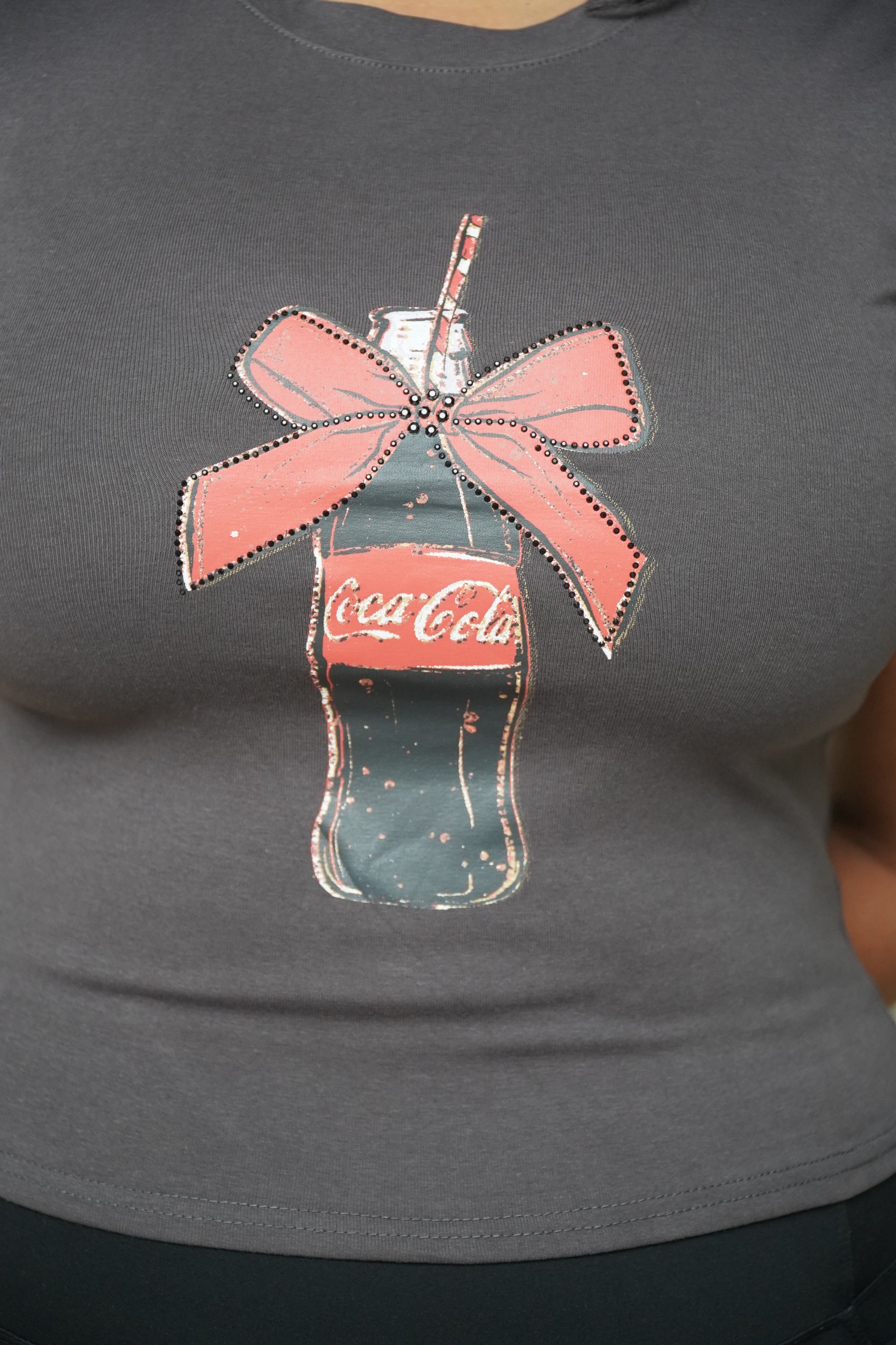 Sassy, sparkly, and straight outta a 2000s soda commercial. This tee is giving Coca-Cola-core meets Mean Girls in detention. The rhinestone bow? It’s giving gift-wrapped glam. Like you, but in tee form. That Coke bottle? Iconic. Just like your taste in chaos and caffeine. Comes in two moods: angelic white and broody grey. Serve it chilled, with a side of drama.