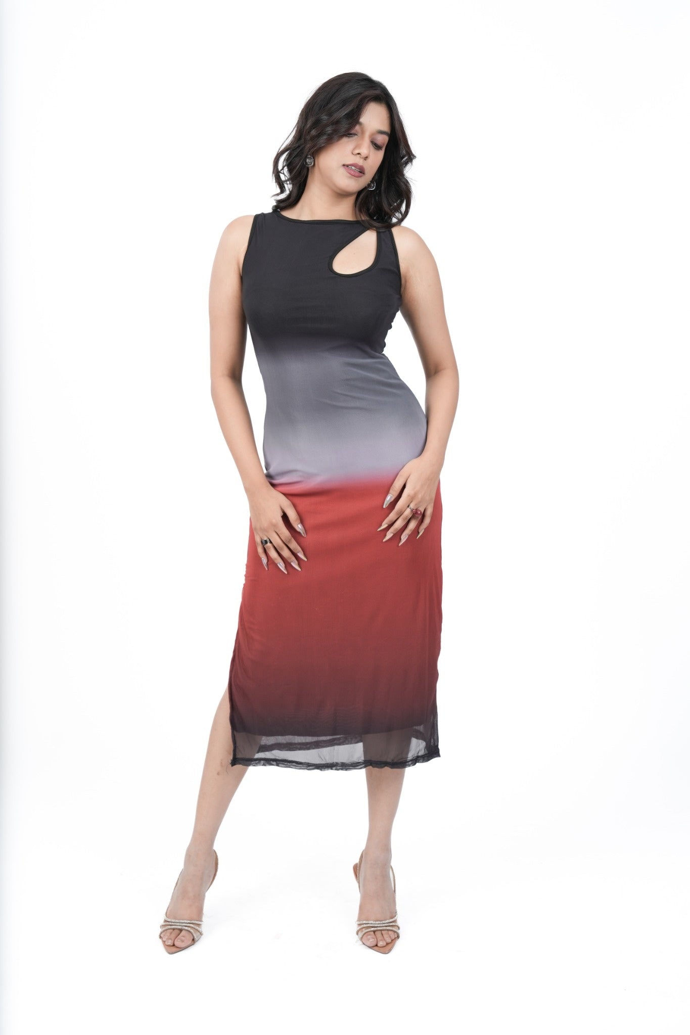 Turn up the heat in this sunset-draped stunner — a body-skimming silhouette that’s pure confidence from every angle. Designed with a chic cutout shoulder for a flirty twist, it melts from black at the top into a rich ombré of grey and deep crimson red at the bottom.
